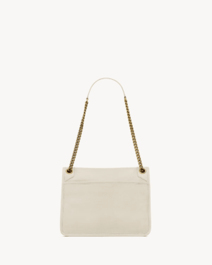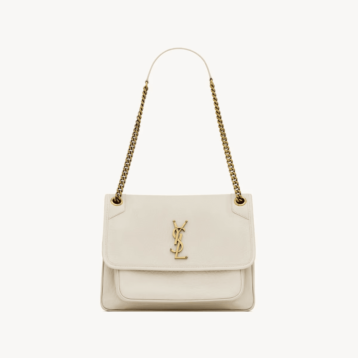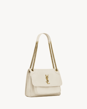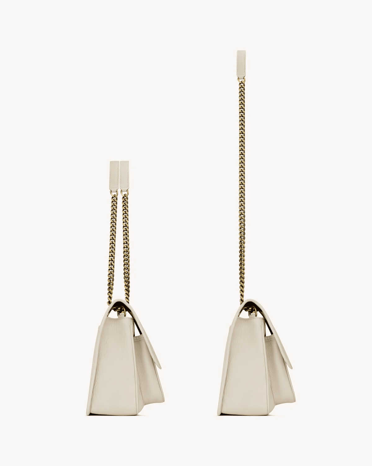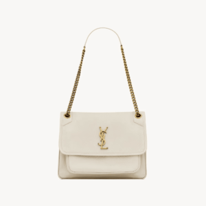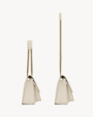 This spacious bag features multiple pockets, while a sliding leather-and-chain shoulder strap allows for both shoulder and crossbody carry options.
